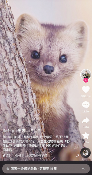 2021年初,作为国家一级保护动物和“东北三宝”之一的紫貂成为新晋“萌宠”。短视频里,小家伙古灵精怪的样子格外讨人喜爱。而拍摄这条视频的抖音创作者“长白山:老万”也因此“出圈”了,短短3天吸粉130多万。年逾花甲的老万,是一位野生动物摄影师,从2014年开始接触摄影,专注拍摄野生动物。几年来,他拍摄的野生动物视频内存超过12 T,先后拍坏16架无人机,年均开车里程近万公里。随着拍摄野生动物的视频作品不断产出,老万心中也燃起一个梦想,他希望带着作品上央视9套(以播出纪录片为主的专业频道),让更多人了解野生动物。