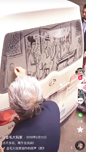 老人在面包车后窗作画,网友评:这是脏得最漂亮的车,五万的车让您画出了五十万的效果(“金毛大玩家”视频截图)