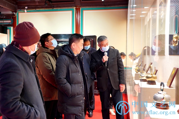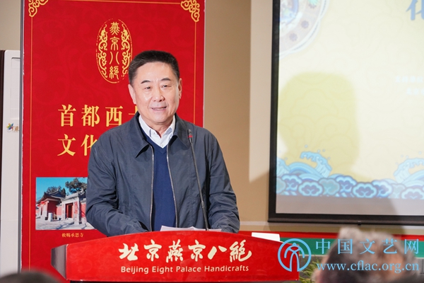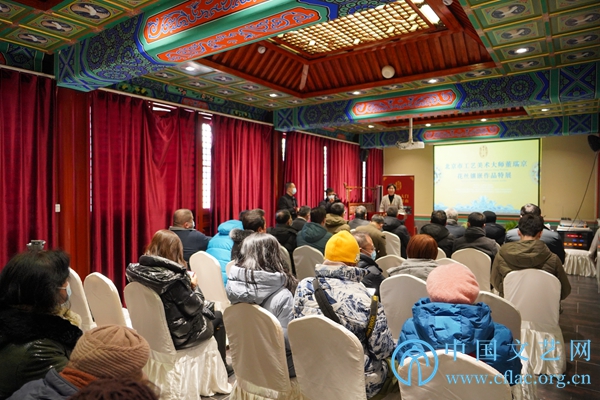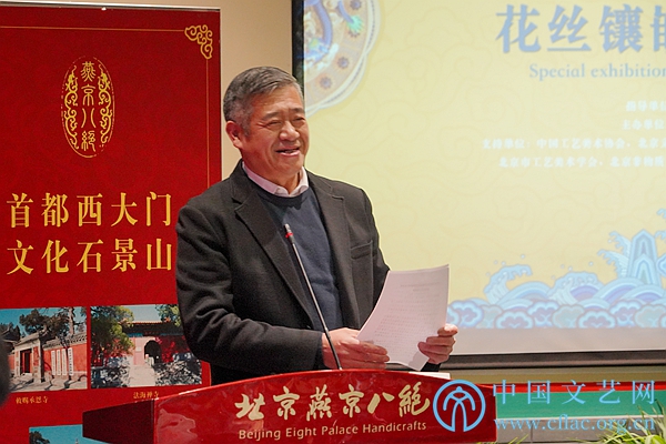 1月16日,“燕京八绝”北京市工艺美术大师董瑞京花丝镶嵌作品特展在京开幕。图为中囯工艺美术协会副会长王志杰致辞。 中国文艺网 王渝 摄