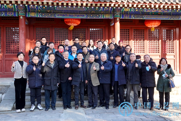1月16日,“燕京八绝”北京市工艺美术大师董瑞京花丝镶嵌作品特展在京开幕。图为参加开幕式的来宾合影。 中国文艺网 王渝 摄