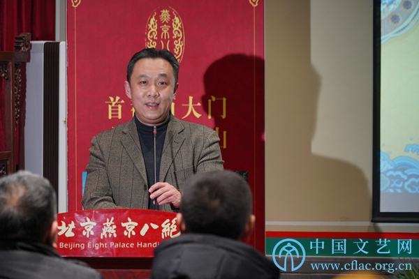 1月16日,“燕京八绝”北京市工艺美术大师董瑞京花丝镶嵌作品特展在京开幕。图为北京燕京八绝协会会长、北京燕京八绝博物馆馆长柏群致辞。 中国文艺网 王渝 摄