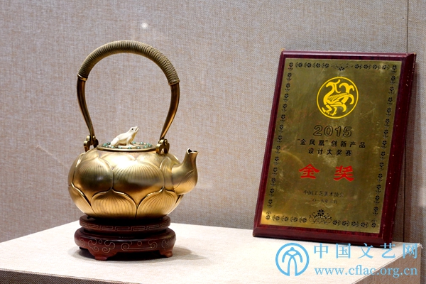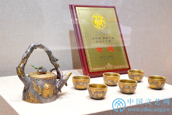 “以前我们‘燕京八绝’的手艺人,都是各干各的,各做各的东西;自从‘当代造办处’成立,把我们聚在一起,群策群力,结合各种技艺的长处,让作品的面貌也焕然一新。”在北京市工艺美术大师董瑞京花丝镶嵌作品特展上,董瑞京感慨地向观众介绍道。呈现在观众面前的银鎏金《和美》壶是董瑞京所传承的国家级非遗“花丝镶嵌制作技艺”的精品之作,曾获2015“金凤凰”创新产品设计大赛奖金奖。别具匠心的是,中国工艺美术牙雕大师李春珂将国家级非遗“象牙雕刻技艺”融入其中,精心为这把壶雕刻了象牙青蛙壶钮,起到了画龙点睛的艺术效果。整件作品既体现了花丝镶嵌工艺的富丽堂皇,又展现出象牙雕刻的古朴雅韵,是两种传统技艺完美的创新融合。