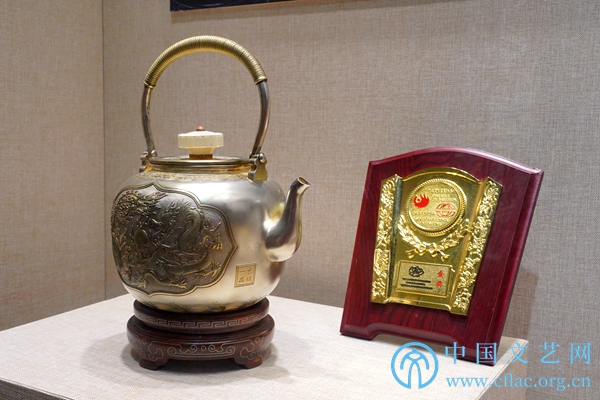 1月16日,“燕京八绝”北京市工艺美术大师董瑞京花丝镶嵌作品特展在京开幕。图为展览展出的董瑞京作品银鎏金《和美》壶。 中国文艺网 王渝 摄