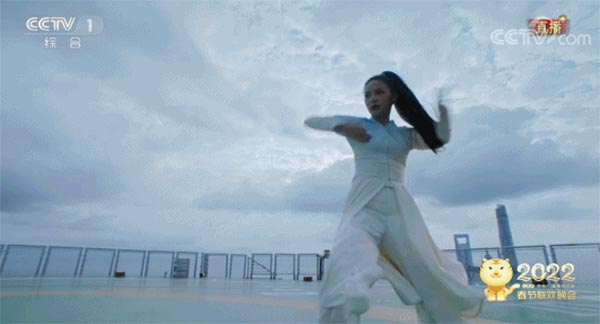 不只此青绿,还有喜庆的洋红朱红砖红,也有“金面”惊艳、白净素雅,文学、戏剧、影视、音乐、书画、曲艺、舞蹈、杂技等艺术,如烟花与雪花竞相绽放。其中《景观太极》突破舞台空间限制,三位武术冠军在上海、重庆、广州四座云端高楼闪转腾挪,一招一式划动城市天际线,行云流水诠释“天人合一”的文体内涵。《冰雪闪亮中国年》跃动冬奥交响音符;北京冬奥会吉祥物“冰墩墩”“雪容融”在经典的《溜冰圆舞曲》中巡看壮美的冬奥场馆。央视春晚迎来40周年,这一对美好生活向往的家国叙事表达,为中华民族“想象共同体”打开一扇五彩心窗,让我们“年”在一起。当然,在配色越趋融和而不浮华的态势中,群舞服饰如能加强艺术设计将更超脱艳丽杂乱。