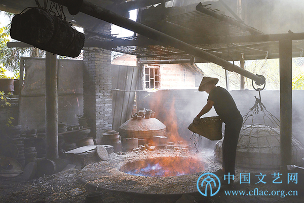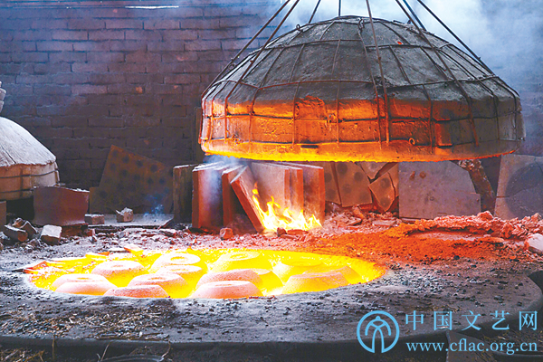 大概一个多小时以后,可以起炉了。两个工人先戴上斗笠,披上一件隔热的披风,再操作悬在空中的长铁管,圆形的窑盖逐渐抬升,炽烈的热浪扑面而来,窑口一片耀眼的红光,窑盖移开,窑中一个个红彤彤的罐子玲珑剔透,井然有序,像烧红的玛瑙,让人心动。两人分别手握4米多长的钢钩,从窑中钩起烧红的罐子,再放入旁边的一个坑里,每钩一个,就有一股热浪涌来,在高温的炙烤下,汗水如雨水一样在工人们的脸颊流淌,但他们始终挥舞手臂,起落有序,迅速而准确地将一个个通红的罐子钩出来放进坑里。然后,再用簸箕给坑里均匀倒进杉木屑,杉木屑遇到炽热通红的砂罐,火焰一下子腾起来,工人赶紧盖上一个铁盖子,肆意乱蹿的火苗就从周围的缝隙中向外扑腾,空气中立刻有裂帛般的声响,融混着杉木、煤炭、泥土的气味儿直钻鼻孔。直到用一些湿泥堵住那些缝隙,火焰才停止了呼呼的喘息。杉木屑燃烧时渗出的油脂,为这些砂罐涂上了一层亮色,经过半小时的冷却,再揭开盖子,就是一个个泛着银光、锃亮黝黑的砂器了。