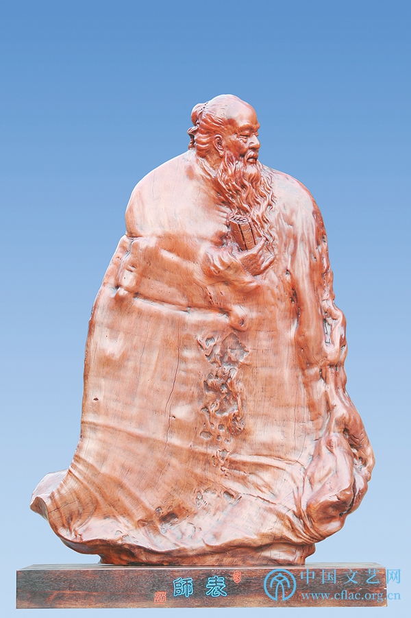 材料本身的扁薄特性,使作品创作吸纳绘画及透视学二维虚拟空间和立体视觉原理、采取类似浮雕的压缩处理手法成为可能。由于作品大多不以平面背景为依托,巧借天然的独特造型,赋予扁薄的外形为理所当然的人为夸张创作想像,与浮雕相比,便更具有了三维立体的圆雕效果。以人物作品《道法自然》为例,该作品高80厘米,宽35厘米,最大厚度仅为4厘米。由于作品充分利用了材料本身厚薄不均的天然特性,在正确辨析头部和躯体主次关系的基础上,根据起位高低进行不同程度的正面压缩,并利用透视学原理,使作品主次之间以虚拟空间的方式巧妙过渡,恰到好处地实现了三维立体的欣赏效果。