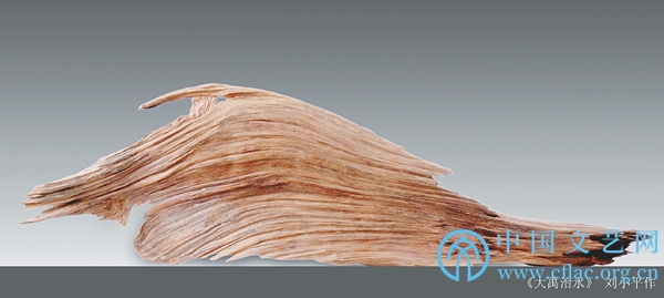 而对于一些过分扁薄的材料,由于已经完全限定了实体空间的可塑性,创作时就有必要借助绘画艺术在构图、题材和空间处理等方面的创作技法。大量的创作实践表明,当作品在构图上形成主体、环境、叙事情节之间的动态连续与转折,或者不同时空视角的自由切换,那么作品诸元素之间的或然性趋势就会成为欣赏者展开想象、丰富感知的虚拟时空。这恰恰与诗家所谓的“诗外有诗”的意境之论有异曲同工之妙。以作品《大禹治水》为例:作品长140厘米,高40厘米,主体雕刻部位最大厚度不足6厘米,由于作品以动态的流水作为造型的环境主体,而立意核心的人物则成为实际环境中的客体。这种主、客体之间的动态连续和自由切换,使整个被侧面压缩的作品呈现出了极富故事情节的内在张力,其险恶环境和治水场面也自然而然地成为被滔天洪水吞没下的的或然时空。