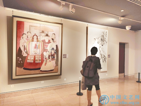 中国美术馆学术邀请系列展“中华民族一家亲”中国画作品展4月14日在中国美术馆开展。本次展览囊括了民族题材中国画作品近80件,作品既坚守了中国传统美学观念,又融入了多元文化交互之下的人文元素,表现出中华民族和谐相处的繁荣图景。主办方表示,本次展览是中国美术馆积极践行习近平总书记“促进各民族像石榴籽一样紧紧抱在一起”讲话精神、迎接党的二十大胜利召开的具体举措。展览将持续至5月17日。图为展览现场。