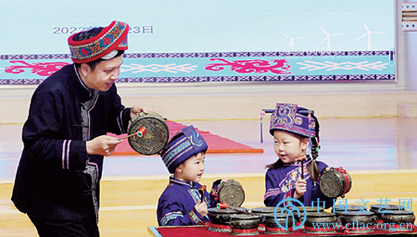 5月23日,广西河池市文艺志愿者开展以“强国复兴有我”为主题的民间文艺进校园活动,志愿者们先后走进市直机关幼儿园、金城江区第二小学、市职业教育中心学校,向师生们传授仫佬族剪纸、音乐铜鼓、彩调等民族文化技艺,受到师生们的欢迎。中新社发 高东风 摄