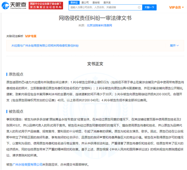 6月6日,迪丽热巴与广州永铨商贸有限公司网络侵权责任纠纷一审法律文书公开。