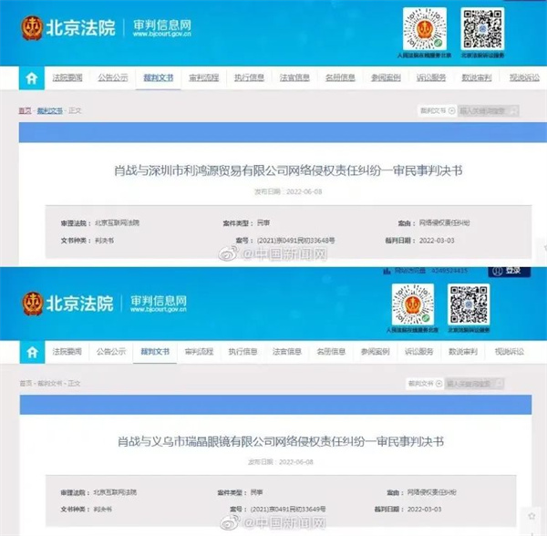 6月8日,肖战起诉深圳市利鸿源贸易有限公司、义乌市瑞晶眼镜有限公司擅自将本人肖像和姓名用于店铺和产品的宣传及推广,并恶意P图。法院判决,此行为侵犯其肖像权获得胜诉。利鸿源公司、瑞晶眼镜公司需立即删除侵犯肖战肖像权的内容,致歉并分别赔偿肖战5.8万余元、4万余元。