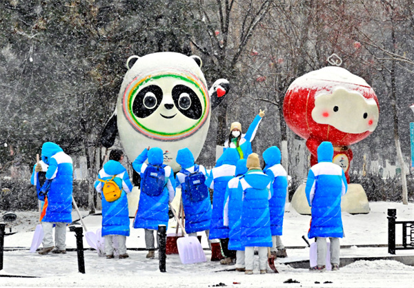 2月13日,伴随着天气的变化,气温骤降,张家口下起了大雪。一大早,在2022张家口媒体接待站的志愿者们闻雪而动,参与到清雪队伍中,有的帮助记者搬运行李,不时还和“冰墩墩、雪容融”打卡问候,场景十分让人感动,充分体现了奉献、友爱、互助、进步的志愿精神。刘通 摄