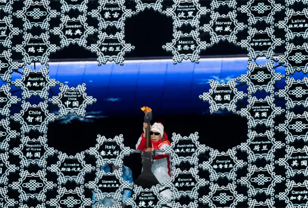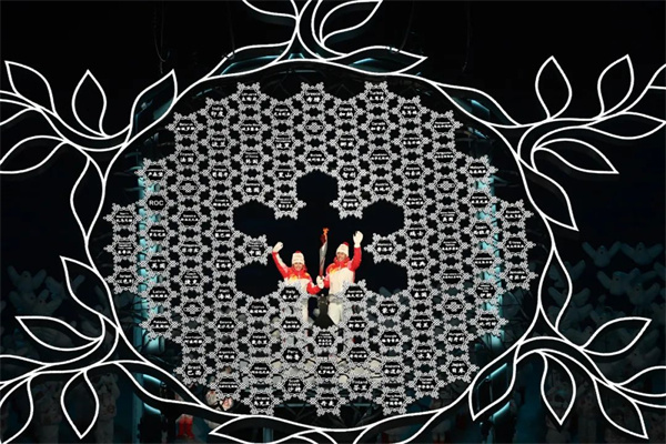 2月4日晚,第二十四届冬季奥林匹克运动会开幕式在北京国家体育场举行。火炬手迪妮格尔·衣拉木江和赵嘉文准备将火炬嵌入“大雪花”中央。毛建军 摄