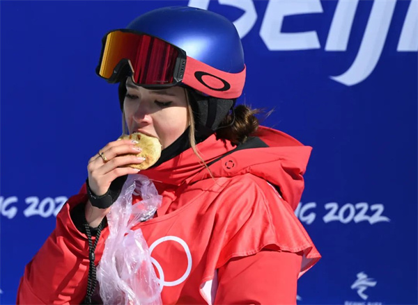 2月14日,北京2022年冬奥会自由式滑雪女子坡面障碍技巧资格赛在张家口云顶滑雪公园举行。图为谷爱凌在比赛后吃韭菜盒子。中新社记者 翟羽佳 摄