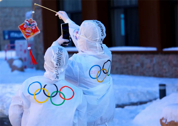 2月15日,中国传统佳节元宵节,延庆冬奥村里洋溢着别样气氛。两名志愿者高举虎年灯笼并用手机记录下这一美好时刻。卫一 摄