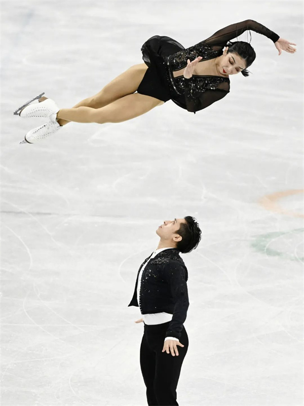 2月4日,北京2022年冬奥会花样滑冰团体赛双人滑短节目比赛在首都体育馆举行。中国选手隋文静(上)韩聪在比赛中。毛建军 摄