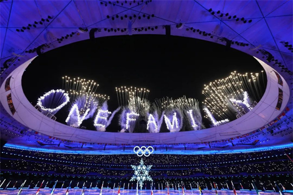 2月20日晚,北京第二十四届冬季奥林匹克运动会闭幕式在国家体育场举行。焰火在“鸟巢”上空显示出中文“天下一家”和英文“ONE FAMILY”字样。李舸 摄