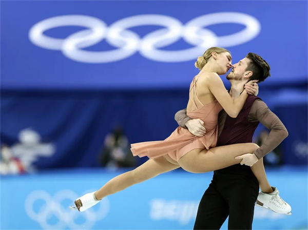 2月14日,北京2022年冬奥会花样滑冰冰上舞蹈自由舞比赛在首都体育馆举行。俄罗斯奥委会选手亚历山德拉·斯捷潘诺娃(左)和伊万·布金在比赛中。兰红光 摄