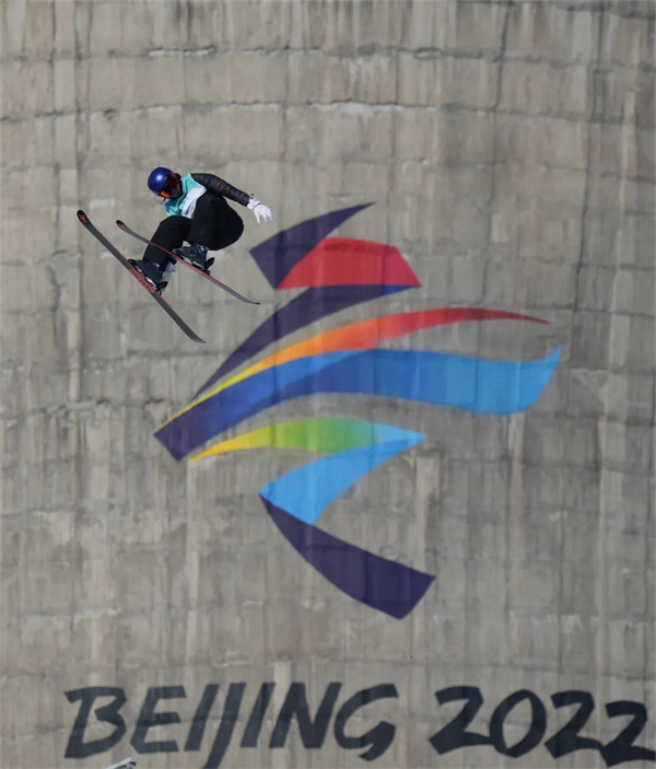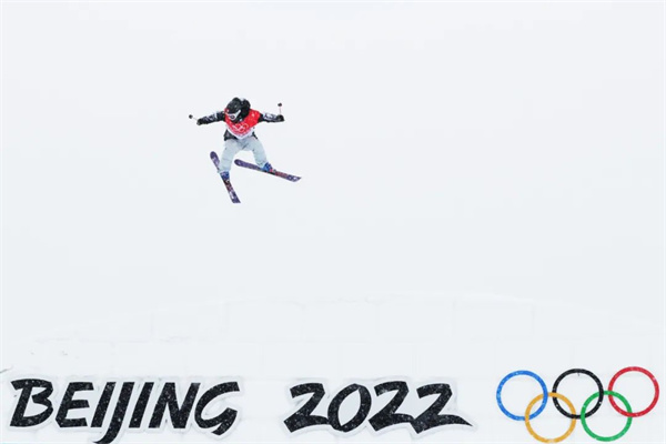 2月13日上午,张家口崇礼云顶滑雪公园。冬奥会自由式滑雪女子坡面障碍技巧资格赛开赛前,参赛运动员正在进行赛前训练。胡金喜 摄