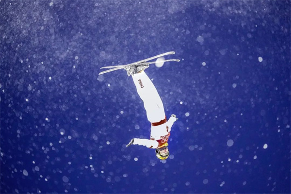 2月8日,北京2022年冬奥会自由式滑雪女子大跳台决赛在北京首钢滑雪大跳台举行。中国选手谷爱凌在比赛中。赵迎新 摄
