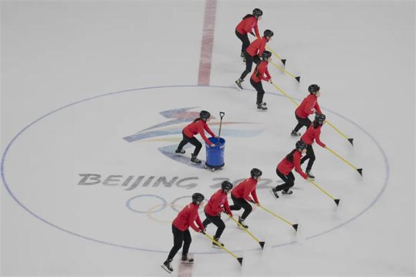 2月6日,北京2022年冬奥会女子冰球小组赛在五棵松体育中心举行。这是赛场工作人员清理冰面。赵迎新 摄