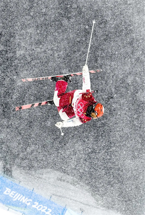 2月16日,北京2022年冬奥会自由式滑雪男子空中技巧决赛在张家口赛区云顶滑雪公园举行。中国选手齐广璞赛前热身训练。魏征 摄