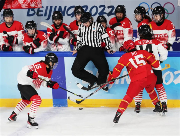 2月6日,北京2022年冬奥会女子冰球小组赛在五棵松体育中心举行,中国队以2比1战胜日本队。胡金喜 摄