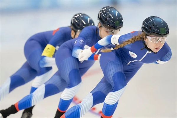 2月12日,北京2022年冬奥会速度滑冰女子团体追逐1/4决赛在国家速滑馆“冰丝带”举行。俄罗斯奥委会选手伊丽莎白·戈卢别娃(右)和队友在比赛中。陈建 摄