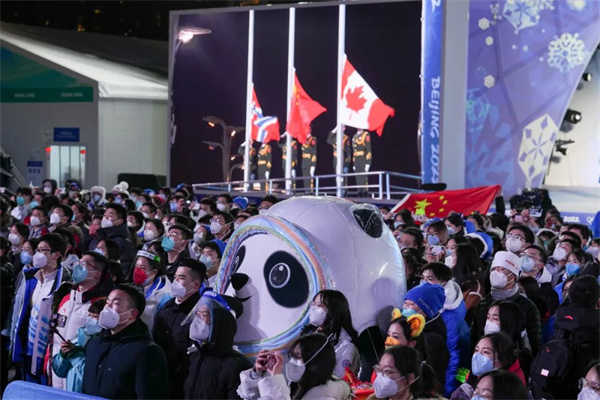 2月15日,在北京2022年冬奥会北京赛区奖牌颁发仪式上,“冰墩墩”与观众一起行注目礼。王伟伟 摄