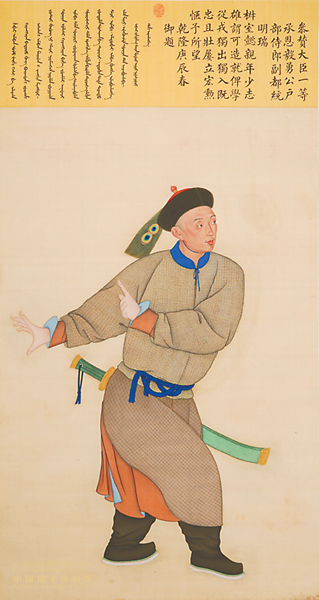 《明瑞像》中,贵公子富察·明瑞两手向后,身体半蹲扭向前方,眼斜视前方,动作颇为“销魂”,却是他的一个经典动作。明瑞是承恩公富文之子、大学士傅恒之侄,清中期名将,因平叛、征缅有功,封一等诚嘉毅勇公。朱万章介绍,“明瑞是将军,要带兵打仗,经常要操练士兵,他要教士兵做动作,所以图上所画的是他长期以来最经典的一个动作。”