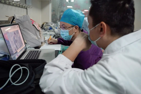 演员确定后,董越开始带领全组进入“培训”状态。武汉市第一医院为电影拍摄提供了一整个ICU病区,并为电影主创团队采风培训提供了全力支持。武汉市第一医院重症医学科主任范学朋业务能力优秀,既在影片中实名出演,而且也为影片做了医学指导。采访和培训时,大家面对范主任基本上是一个问题接着一个问题狂轰滥炸式地提问,了解药品、器械使用、插管步骤、病人情况等等各种细节,还用模拟的人体做急救培训……培训结束后,大家基本上对ICU所有的工作有了比较清晰的概念,也都清楚知道拍摄发力点在哪儿。