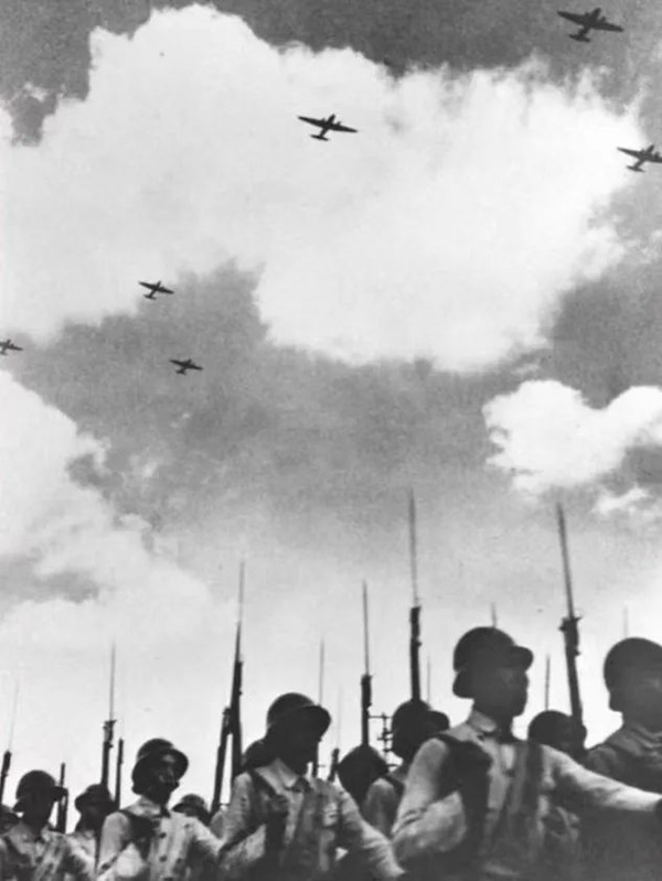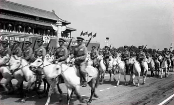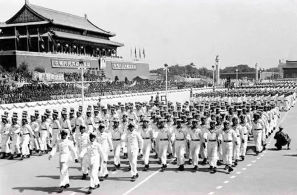 1950年国庆大阅兵,也是第一个国庆节阅兵, 阅兵分列式以空军学校和海军学校的学员为先导,依次为步兵、炮兵、战车摩托化步兵和骑兵部队,空军空中梯队的各种战机在步兵进入天安门广场时临空。