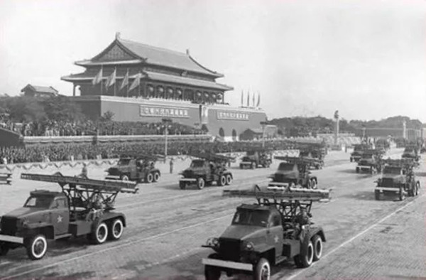 1953年国庆大阅兵,是火箭炮兵首次受阅。中国人民志愿军国庆节归国观礼代表团在天安门前观礼台上参加观礼。