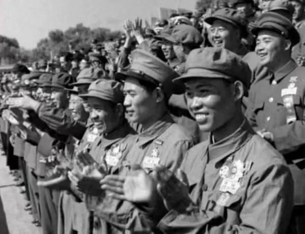 抗美援朝战争中凯旋的中国人民志愿军国庆节归国观礼代表团在天安门观礼台上