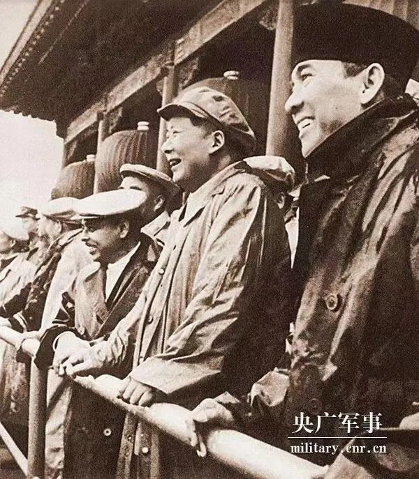 1956年国庆大阅兵,毛主席和印度尼西亚总统苏加诺、尼泊尔首相阿查里雅在天安门城楼上 (侯波摄)