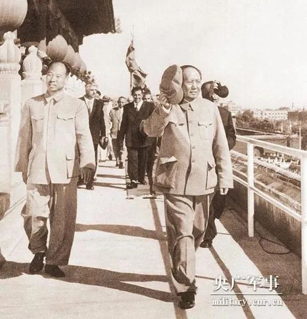 1959年国庆大阅兵,毛主席在天安门城楼上挥帽致意