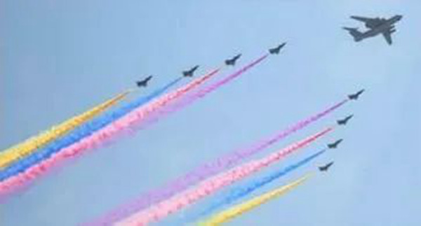 新成立的中国人民解放军空军编队飞过天安门广场上空
