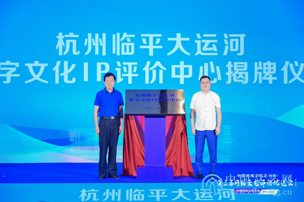 8月23日,由中国文艺评论家协会指导,中国文艺评论家协会新媒体委员会、浙江省文艺评论家协会、杭州市文联、杭州师范大学、杭州市临平区委区政府共同主办的“技术革新与艺术开拓:中国网络文艺这十年”论坛在杭州举行。图为中国作协网络文学委员会主任、中国作协原副主席、书记处书记陈崎嵘与临平区委宣传部常务副部长、网信办主任、新闻出版局局长陈坚为“杭州临平大运河数字文化IP评价中心”揭牌。