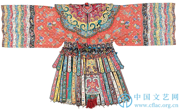 在清华大学艺术博物馆,便珍藏有一件绝美的清代“霓裳羽衣”。此衣圆立领,衣裳相连。肩部有三层彩色云肩,均作八如意云头式,上绣有36人,神情各异,姿态生动。腰际以上,以大红色缎为地;采用盘金绣,绣花卉状四合如意云纹,其内间饰万字纹、花卉纹,一起构成网状装饰底纹;其上采用平针、打籽、戗针等多种绣法,绣出鸾凤、梧桐、牡丹、兰花、梅花、菊花、皮球花等各式纹样,可谓“锦上添花,花上生华”。舒袖宽大,左右袖口各镶缀11条彩绣花边,共22条,名趟袖,以“百子图”为题材。腰部罩腰围,以青色缎为地,彩绣花卉博古纹,纹饰丰富,针法多样。裳部分则由百褶裙与凤尾裙共同构成,凤尾缎裁剪作条,末端裁剪成宝剑形状,共82条,色彩各异,底端缀有葡萄形铃铛,寓“多子多福”。