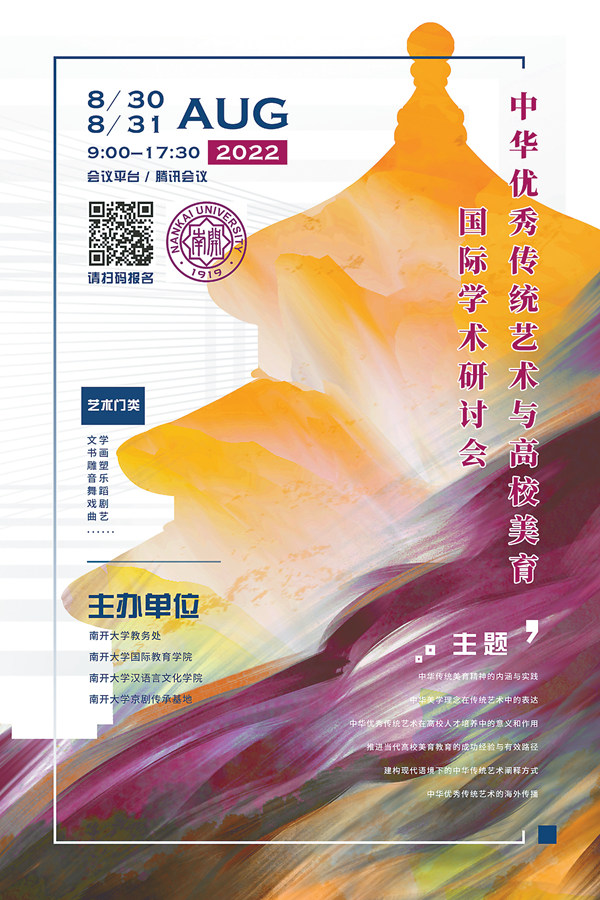 8月30日至31日,南开大学国际教育学院、汉语言文化学院举办“中华优秀传统艺术与高校美育”国际学术研讨会。本次会议在线召开,南开大学副校长王新生出席开幕式并讲话。在为期两天的会议中,来自海内外各高校、艺术研究机构的36位专家学者和第一线的美育教育工作者相聚云端,围绕美育理论及文学、美术、音乐、戏剧、曲艺、工艺美术、艺术设计等多个门类进行了主旨发言和经验分享。活动期间还举办了“不忘初心迎盛会,勇于担当铸忠诚——京剧校史剧《爱国三问》线上展演”活动,回顾南开故事、感悟南开精神。
