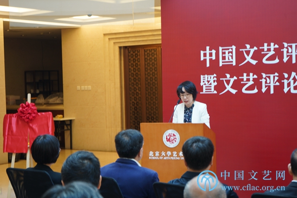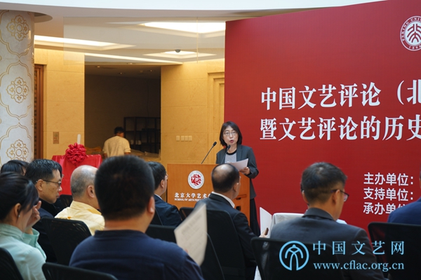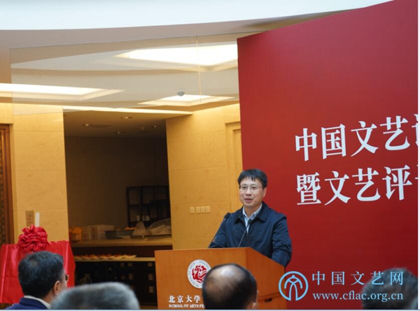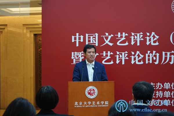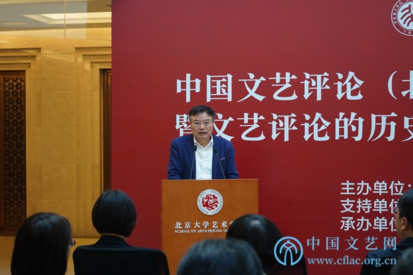 9月23日,由北京大学主办,中国文艺评论家协会支持,北京大学社科部、北京大学艺术学院、中国文艺评论(北京大学)基地承办的中国文艺评论(北京大学)基地揭牌仪式暨文艺评论的历史感与现实性学术研讨会在京举行。图为中国文艺评论家协会副主席兼秘书长、中国文联文艺评论中心主任徐粤春讲话。