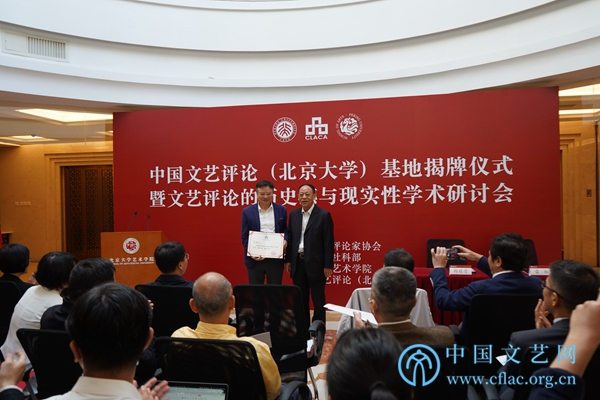 9月23日,由北京大学主办,中国文艺评论家协会支持,北京大学社科部、北京大学艺术学院、中国文艺评论(北京大学)基地承办的中国文艺评论(北京大学)基地揭牌仪式暨文艺评论的历史感与现实性学术研讨会在京举行。图为中国文艺评论家协会主席夏潮为中国文艺评论(北京大学)基地主任、北京大学艺术学院院长彭锋颁发聘书。