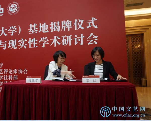 9月23日,由北京大学主办,中国文艺评论家协会支持,北京大学社科部、北京大学艺术学院、中国文艺评论(北京大学)基地承办的中国文艺评论(北京大学)基地揭牌仪式暨文艺评论的历史感与现实性学术研讨会在京举行。图为中国文艺评论家协会副秘书长、中国文联文艺评论中心副主任杨晓雪与北京大学艺术学院党委书记雷虹共同签署《中国文艺评论基地(第二批)共建协议书》。