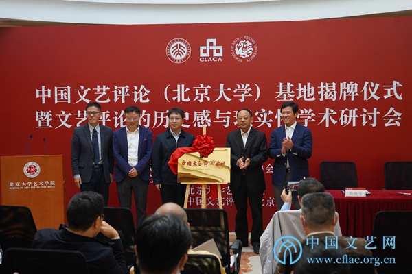 9月23日,由北京大学主办,中国文艺评论家协会支持,北京大学社科部、北京大学艺术学院、中国文艺评论(北京大学)基地承办的中国文艺评论(北京大学)基地揭牌仪式暨文艺评论的历史感与现实性学术研讨会在京举行。图为夏潮、徐粤春、孙庆伟、向勇、彭锋共同为中国文艺评论(北京大学)基地揭牌。