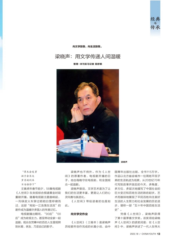 《中国青年》2022年第4期发表的《专访梁晓声:用〈人世间〉,写就温暖人间事》一文中,梁晓声分享了对文学创作的真知灼见和对“好人文化”的推崇,本文特此节选了部分内容,以飨读者。