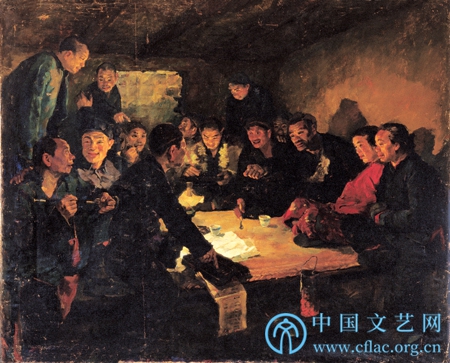 如今重看《农民小组会》,画面中那份浓郁醇厚的色彩质地、温暖纯朴以暗影衬托的明亮光线、紧凑向心的满满构图,尤其那些幸福洋溢、热情奋发的农民们的笑脸扑面而来,令人十分感动与震撼。这是与共和国同庚、同辉的作品,也是戴泽先生告别了他先前以旁观者身份,略带沉思、凝虑、忧郁之笔所画尺幅不大的水彩画中所表现的北平老百姓的贫苦无助后,开启的一个历史新纪元的里程碑。这件作品让我们感受到:无论是画家还是他所画的农民们,热情参与建设新中国的振奋、沐浴共和国清晨的阳光和传布新中国温馨灯火的青春记忆,都值得我们回想重看与深深纪念。