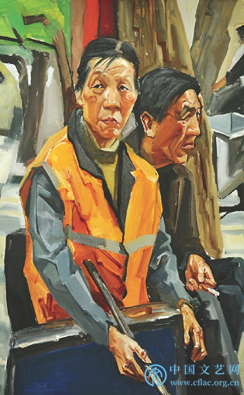 王小胜的油画《街边摊》《清洁工》《人体》《室内》源于生活而不拘泥于生活,运心而思,因心造境,以个性化的艺术语言记述了自己人生的感受与感悟。画中意境有一往之情深,有淡淡之伤怀,有莫名之情愫,有惬意之追忆,有会心之莞尔,有平静之思索,有热切之关注,有正面之注视,有反方之思考,有生活之情调,有文化之品位,其情倾泻于笔之物象,莫不赋予鲜活之生命、有机之秩序。于是,一种表露个性、抒发情怀的艺术语言生动而出,这种语言是无声的,但“此时无声胜有声”。彼此毫不相干的、抑或有一定关联的物象因一个浓浓的“情”字连在一起,它们被画家别具匠心地撮合在一起,或错落有致地排列,或相呼相拥地聚合,静中有动,动中有静。静得有品位,动得有情趣。每个组合都构成一个有深远意境的生活特写。这些特写恰似一幕幕话剧,而那些被表现的物象恰如演员,它们正在以独白、对话的形式告诉读者,画家在这场话剧中所要表达的心灵深处的情感。