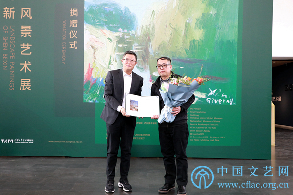杜鹏飞为谌北新家属谌河颁发捐赠证书,感谢谌北新先生为清华大学艺术博物馆捐赠《莫奈故居希尼威尔尼的睡莲池塘》等10件油画作品。