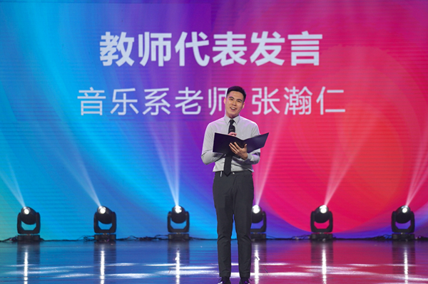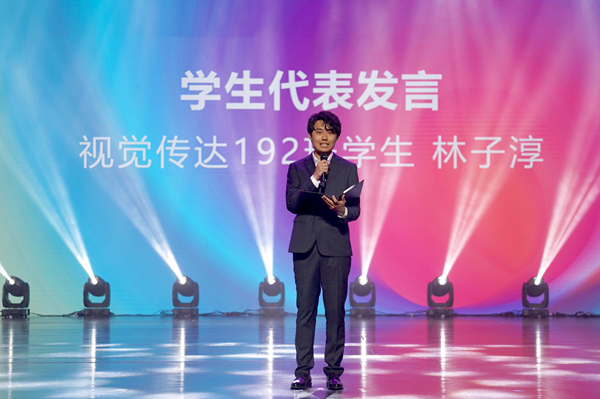 教师代表张瀚仁在寄语中希望毕业生们在今后能够继续关注社会、关注人民、关注时代,在提升专业水准和个人素养的基础上,用艺术照亮人们的生活,用艺术推动社会的进步。毕业生代表林子淳深情回顾大学生活,表达了对母校的眷恋,并表示将不忘初心,砥砺奋进,怀抱梦想,勇挑重担。