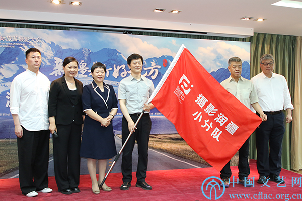 新疆文旅厅党组成员、副厅长余洁向摄影润疆小分队授旗